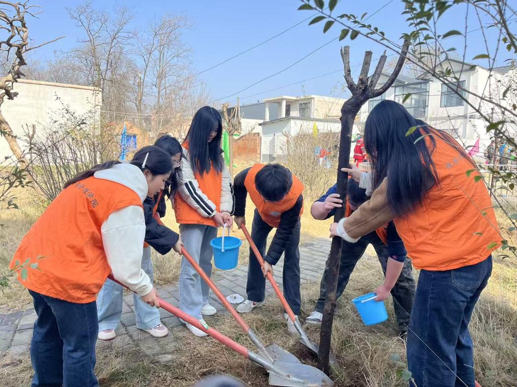 活动在安村镇新华村广场正式启动,师生们认真听取主办方关于活动意义与流程的介绍,深刻理解了本次活动融合生态建设、社会公益与青少年教育的深远意义。启动仪式后,师生迅速投入到热火朝天的植树劳动中。在耿露老师的组织下,同学们领取了树苗和工具,奔赴指定植树区域。大家挥锹铲土、扶苗培土、提水浇灌,分工明确,配合默契。每一锹土,种下的都是对生态文明的承诺;每一桶水,浇灌的都是对绿色未来的憧憬。全体师生还在自己亲手栽种的树苗上悬挂了标识牌,铭刻下青春的印记与美好的祝愿。随后,志愿者们与新华村小学的孩子们结对,组成“大小搭档”,共同完成植树任务。志愿者们耐心地向孩子们讲解植树步骤、树木养护知识以及保护生态环境的重要性,引导孩子们从小树立爱护自然、保护家园的意识。活动分享环节,学生第五党支部积极分子邓宝林发言,分享了参与本次活动的感受与思考。同学们纷纷表示,能够走出校园,深入乡村,以植树造林的具体行动弘扬雷锋精神,服务乡村振兴,是一次极其珍贵的党性锻炼和社会实践。