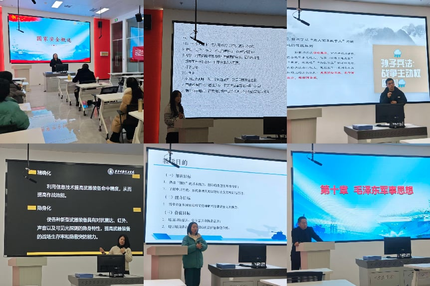 2025年12月17日,我校军事理论教研室(课程组)成功举办“课堂教学质量提升”专项磨课活动。本次活动旨在深入贯彻落实教育部关于本科教育教学审核评估的相关要求,持续深化军事理论课程教学改革,全面提升教师教学能力与课堂育人实效。活动特别邀请西安电子科技大学军事教研室主任鲁雷教授担任评委并作专业指导,课程组全体教师积极参与。