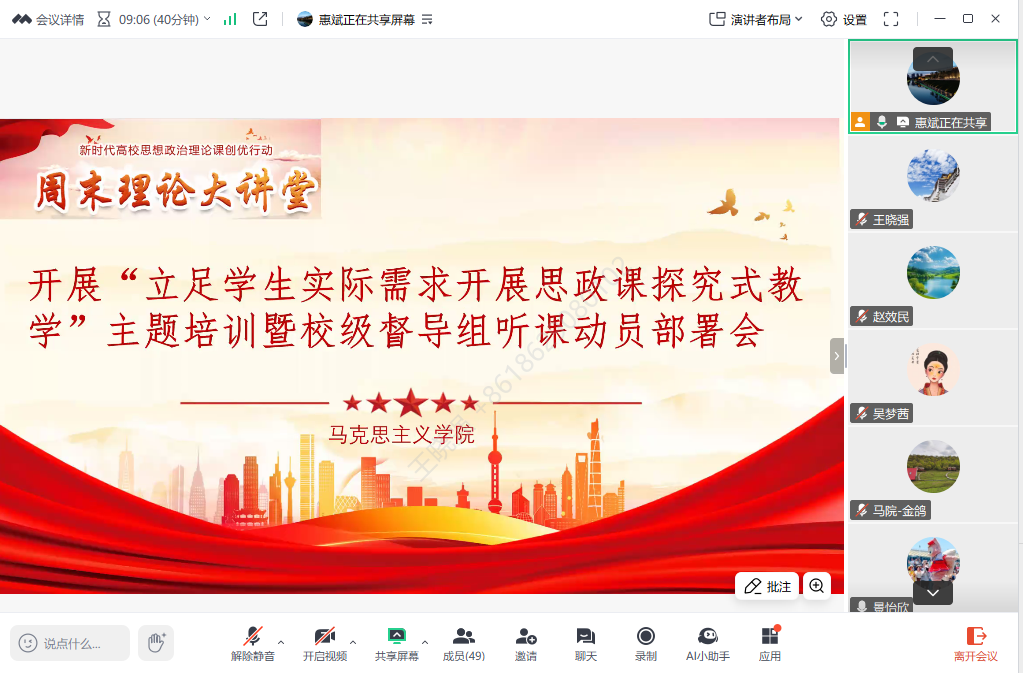 为保障学习效果,学院对本次讲座提出明确要求:参会教师需提前 10 分钟进入线上会议,原则上不得请假,特殊情况需向学院惠斌副院长履行请假手续;会议期间需严格遵守纪律,保持手机关闭或静音状态。全体参会教师认真聆听、积极思考,纷纷表示此次讲座内容详实、指导性强,为今后优化思政课教学模式、提升教学质量提供了宝贵思路。