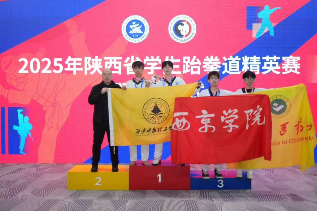 2025年陕西省学生跆拳道精英赛于10月26日在嘉会国际交流中心圆满落幕,全省30余所高校齐聚于此,在竞技与品势项目中展开巅峰对决。我校跆拳道校队在马俊豪、王静妍两位教练员的带领下,14名参赛队员凭借扎实的功底与顽强的斗志,在此次比赛中狂揽四金三银三铜,并且获得团体总分第三名,创造了我校跆拳道队的历史最佳成绩。