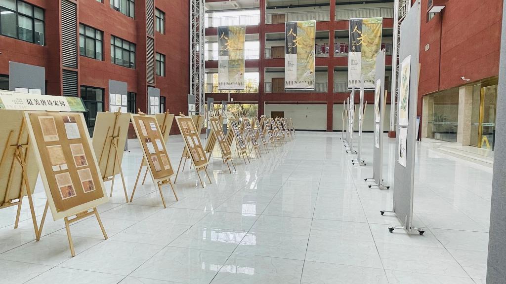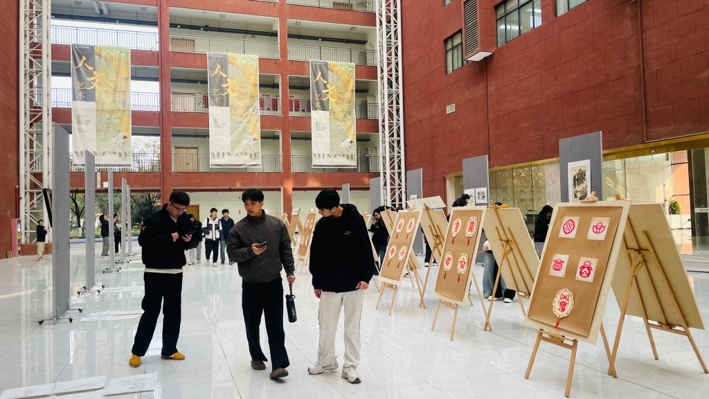 《最美唐诗宋词》:课堂的“诗意书法”将李白、杜甫的经典诗句写成视觉的律动,婉约跃然纸上;《工笔花鸟临摹》:纤毫毕现的翎毛、层层渲染的花瓣,展现传统工笔技法的精妙传承;《中国山水画》:师生以“搜尽奇峰打草稿”的创作理念,将秦岭山水与创作感悟融入笔墨,勾勒出“可行可望可游可居”的东方美学;《摄影入门基础》:通过光影捕捉校园四季、城市变迁,定格平凡生活中的诗意瞬间;《陕西民俗艺术鉴赏》:剪纸、皮影等非遗元素被赋予现代设计语言,焕发传统文化的时代生机。此外,学生社团《国艺非遗社团》的展区也非常引人注目,成员们通过沉浸式体验衍纸、掐丝珐琅等非遗技艺,创作出兼具传统韵味与青春创意的作品,成为展览中“活态传承”的生动注脚。
