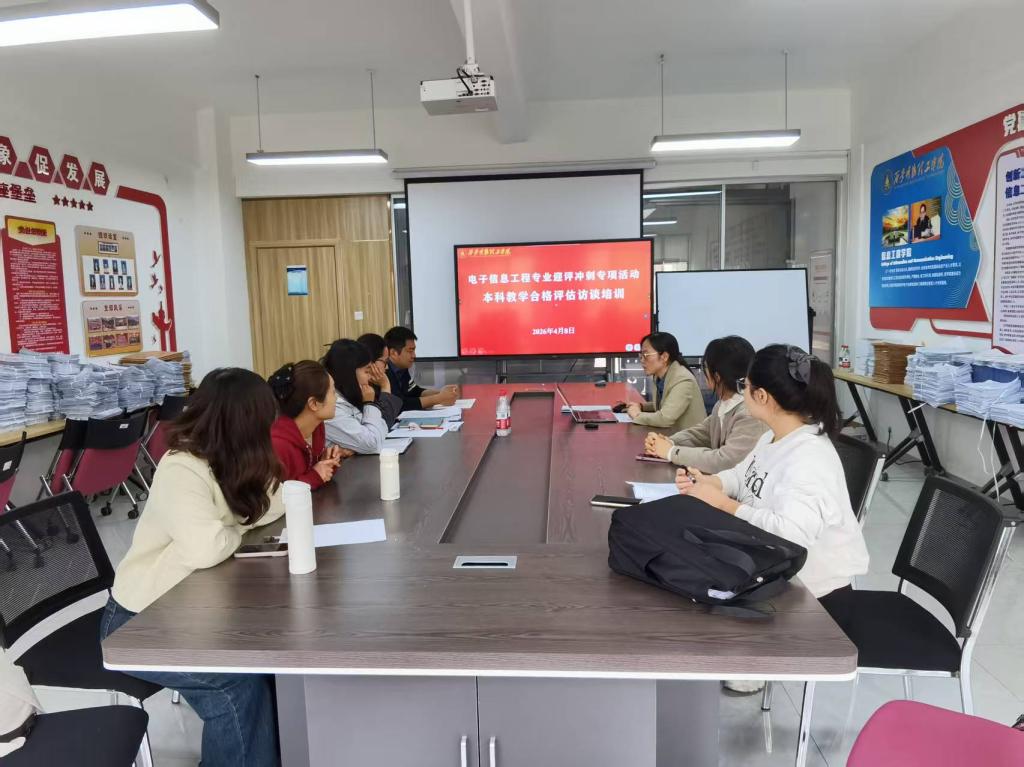 为夯实本科教学工作合格评估迎评基础,提升专业教师评估访谈应答能力,确保专家组入校考察环节口径统一、应答精准,4月8日,电子信息工程专业面向全体专任教师开展本科教学合格评估访谈专题培训,以专业培训强化迎评准备,规范访谈应答标准。培训紧扣评估工作核心要求,围绕本科教学合格评估基本常识、学院与专业核心办学数据、专家访谈高频问题、标准化应答规范等内容展开系统讲解。参训教师重点巩固评估“二十字方针”、指...