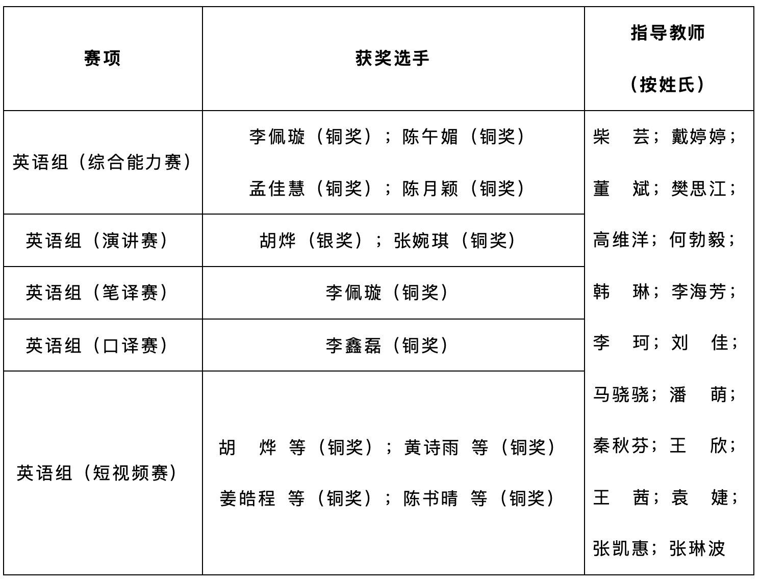本次陕西省赛英语组设置综合能力赛、演讲赛、笔译赛、口译赛、短视频赛5个分赛项,我校选手在各赛道全面发力,多点突破,具体获奖名单如下: