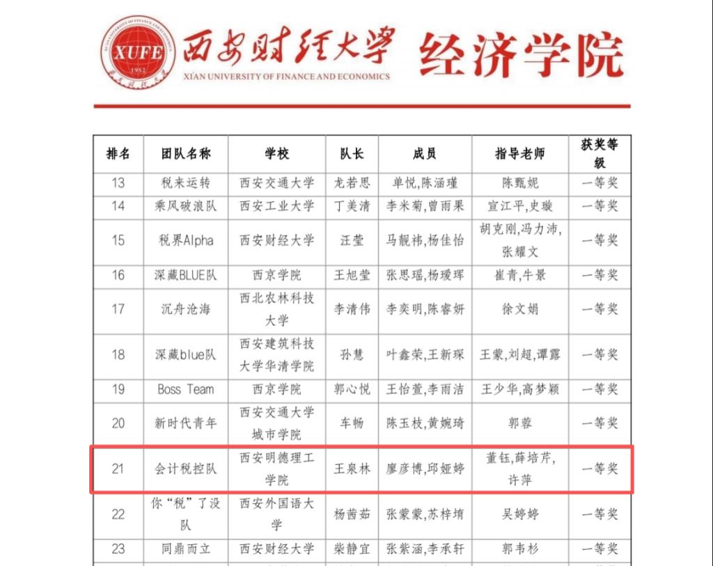 11月3日,2025年全国本科院校税收风险管控案例大赛圆满结束,经济与管理学院参赛队喜获陕西赛区一等奖一项、三等奖一项。自赛事启动以来,学院积极响应、认真筹备,在薛培芹、康晓欢、杨正波、董钰等会计学专业教师的指导下,五支代表队的十五名同学凭借扎实的理论功底、良好的分析能力与高效的团队协作,在激烈竞争中脱颖而出,获得佳绩。