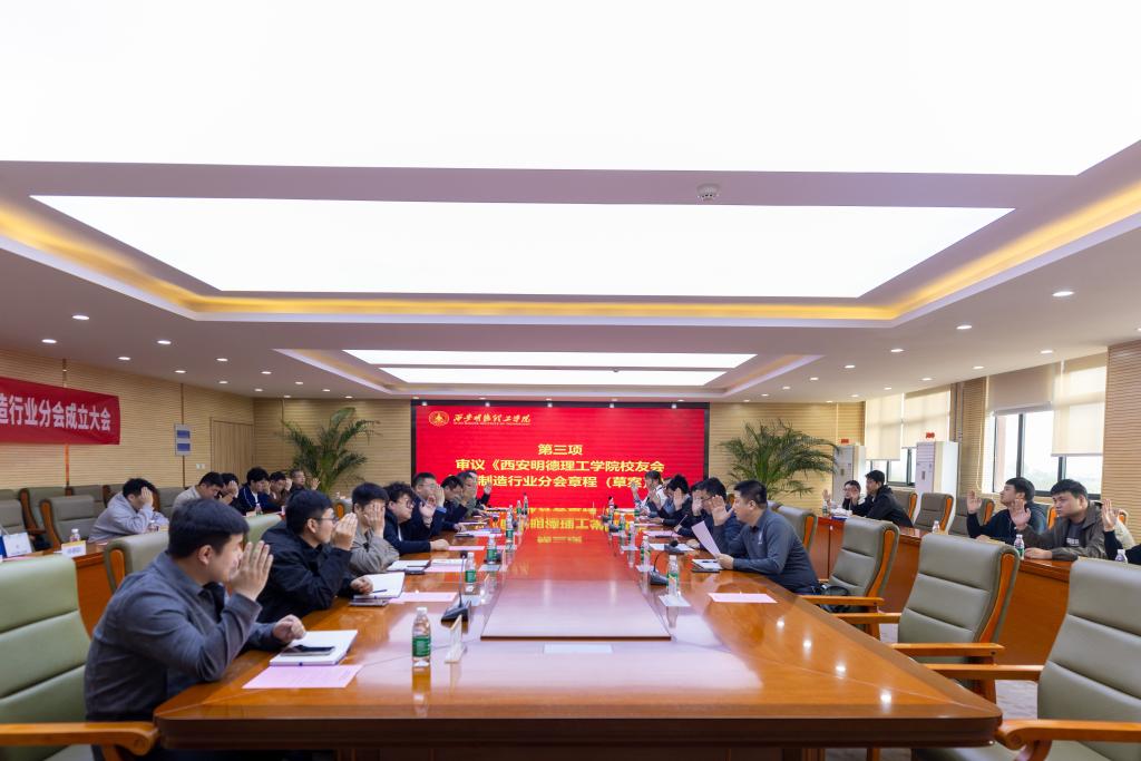 随后,校友办公室主任侯磊宣读《关于同意成立西安明德理工学院校友会智能制造行业分会的批复》。经全体参会人员审议表决,一致通过《西安明德理工学院校友会智能制造行业分会章程(草案)》及首届理事会成员名单,宁宇飞当选会长,杨勇任秘书长,王瑾任理事长。