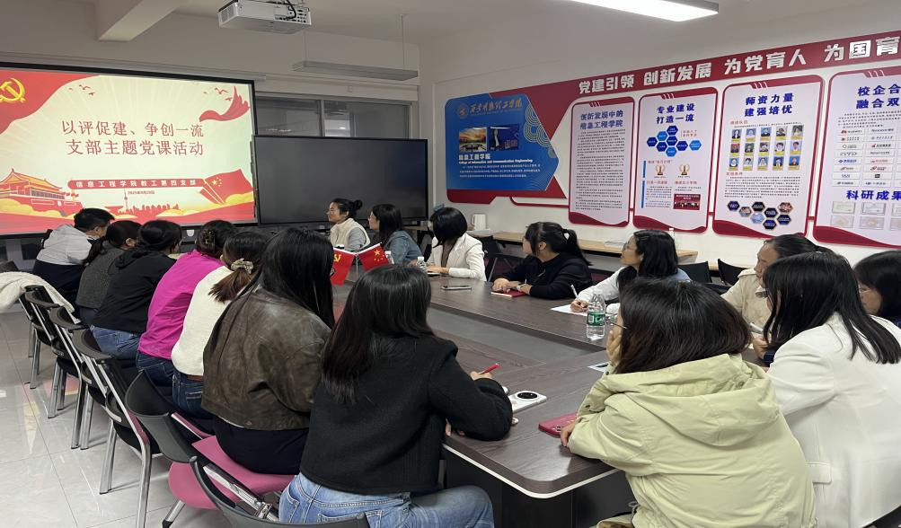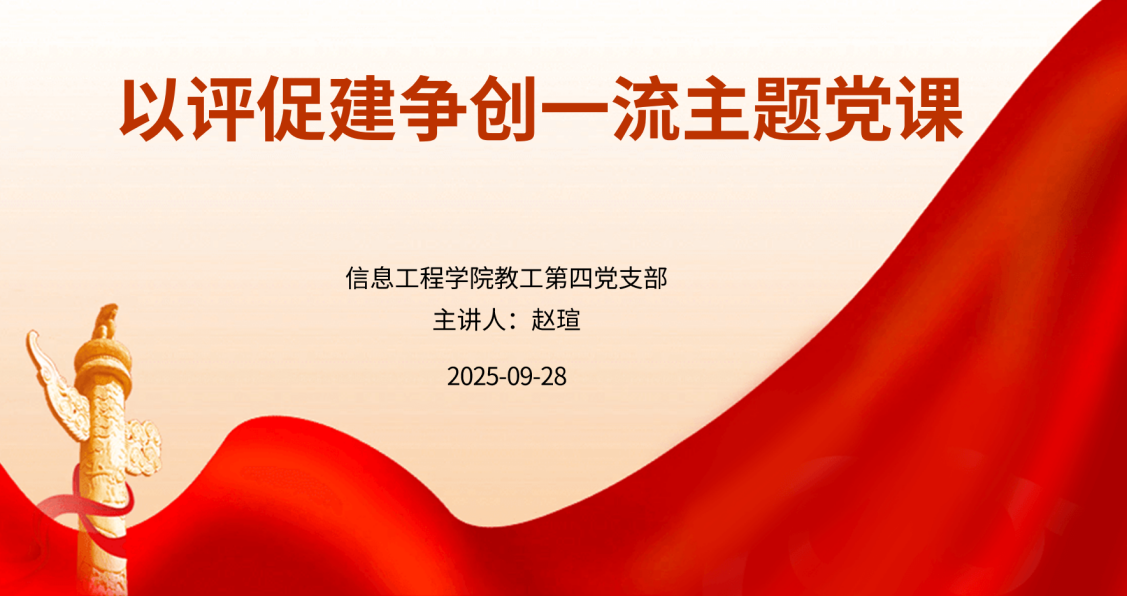 2025年9月28日,西安明德理工学院信息工程学院教工第四党支部成功举办"以评促建、争创一流"主题党课。本次活动由党支部书记张健主持,赵瑄老师担任主讲,支部全体党员参加学习。