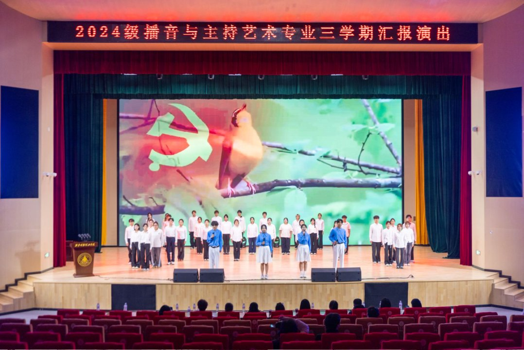 艺术与设计学院党委副书记乔建、艺术与设计学院副院长、播音与主持艺术专业负责人姚璐,播音与主持艺术专业教师王雪娇、何婕、瑚琼、陈叶娟、孟舒楠、许培瑾、王丽娜、戴志远等专业老师也一同到场,为学子们的专业汇报给予支持与指导。 从礼赞山河的舞韵开篇,到聚焦校园动态的新闻播报;从复刻“三下乡”边疆温度的情景讲述,到诠释青春无畏的现代舞演绎;从以“风”为喻、承载理想信念的朗诵,到唤醒孝亲美德的歌舞共情;从回溯“觉醒年代”热血征程的舞台剧,到演绎中华文脉之美的古典舞,再到立下“强国有我”誓言的激昂诵读,到夜空中最亮的星的温情歌唱——十余组节目以多元艺术形态,在舞台上勾勒出播主学子的专业成长轨迹。彰显了艺术与设计学院在专业教学中融入思政引领、培养学生家国情怀与校园担当的育人成效。