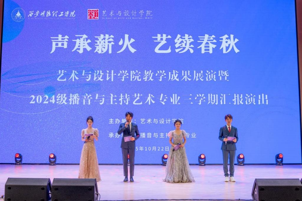 10月22日下午,西安明德理工学院四季廊桥内气氛热烈、掌声不断——艺术与设计学院教学成果展演暨2024级播音与主持艺术专业三学期汇报演出在此圆满落幕。本次展演以“专业赋能、思政铸魂”为内核,既是对播主专业2024级学生三学期学习成果的集中呈现,也是学院深入贯彻“美育与思政协同育人”理念的生动实践,更是“一院一品”特色育人品牌在专业教学成果转化中的鲜活体现。