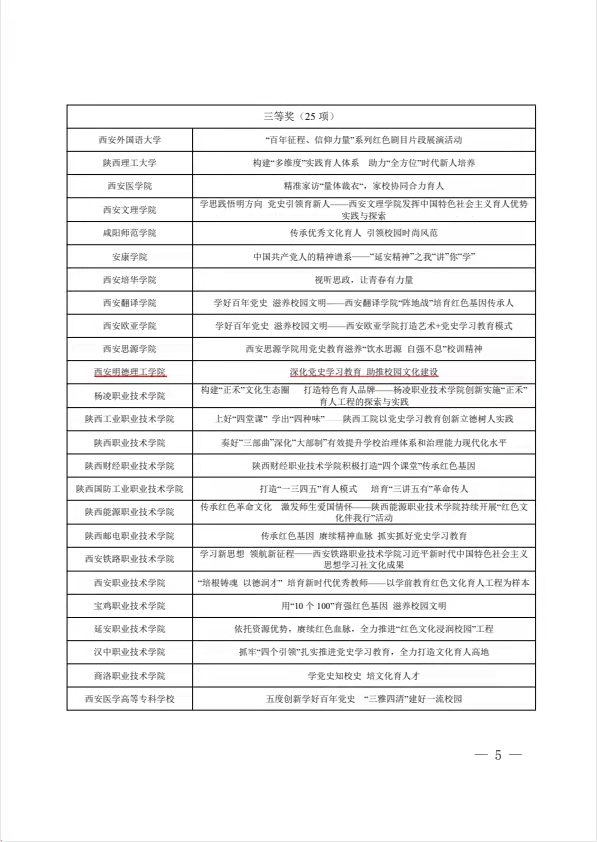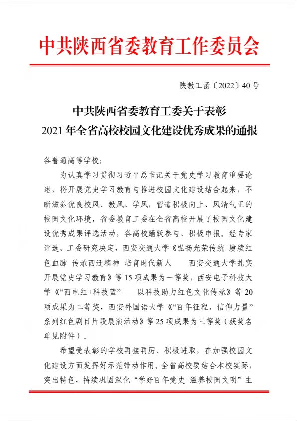 日前,中共陕西省委教育工委表彰了2021年全省高校校园文化建设优秀成果,我校报送的《深化党史学习教育 助推校园文化建设》,荣获陕西省高校校园文化建设优秀成果三等奖。此次评选由省委教育工委组织开展,经全省各高校自主申报,专家严格评审,共评选出一等奖15项、二等奖20项、三等奖25项,此次获奖是对我校校园文化建设成效的充分肯定和有力鼓舞,为我校人才培养奠定坚实的基础。