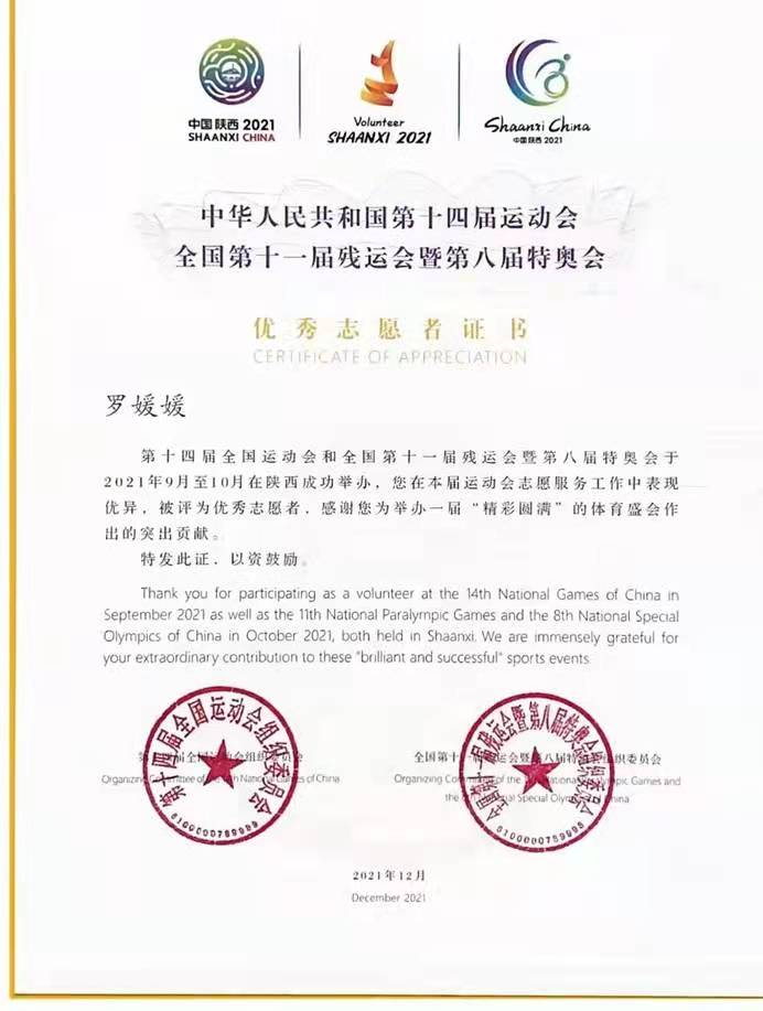 近日,第十四届全国运动会组织委员会办公室、全国第十一届残运会暨第八届特奥会组织委员会办公室联合印发了《关于表扬十四运会和残特奥会志愿服务工作先进单位和个人的通报》,我校荣获“十四运会和残特奥会志愿服务先进单位”;罗媛媛同学荣获“十四运会和残特奥会优秀志愿者”荣誉称号。
