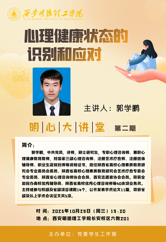 一、培训时间2025年10月29日 19:20二、培训地点西安明德理工学院长安校区六教201三、报告会专家党委学生工作部 郭学鹏四、培训对象 信息工程学院班级与宿舍心理委员今晚我们不见不散~