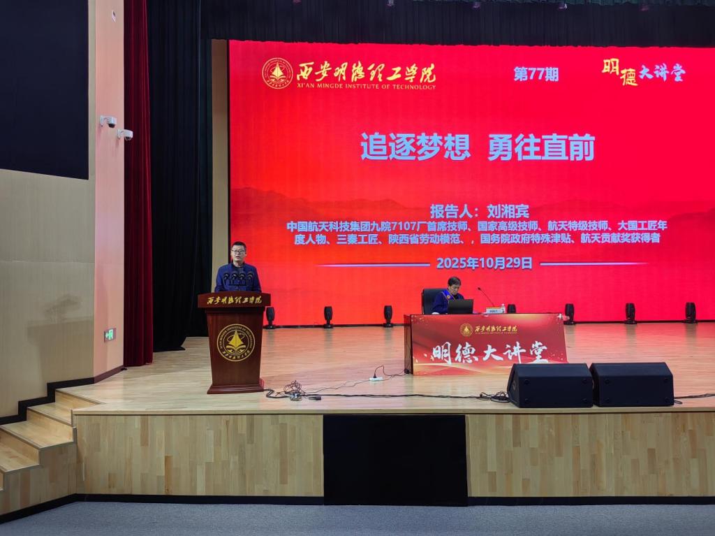 为大力弘扬工匠精神,引导青年学子树立职业理想、坚定奋斗信念,10月29日,我校特邀中国航天科技集团有限公司第九研究院七一〇七厂首席技师刘湘宾做客“明德大讲堂”,以“追逐梦想 勇往直前”为主题,为1000余名师生带来了一场兼具思想深度与实践温度的专题讲座。讲座由马克思主义学院及通识教育学院党委书记王君涛主持。