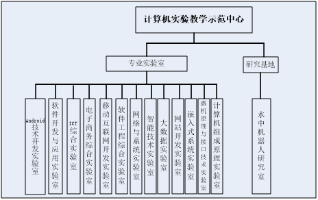 中心目前拥有13个专业实验室和1个研究基地,分别为Android技术开发实验室、软件开发与应用实验室、ICT综合实验室、电子商务综合实验室、移动互联网开发实验室、软件工程综合实验室、智能技术实验室、网络与系统实验室、大数据实验室、网站开发实验室、嵌入式系统实验室、微机原理与接口技术实验室、计算机组成原理实验室和水中机器人研究室。